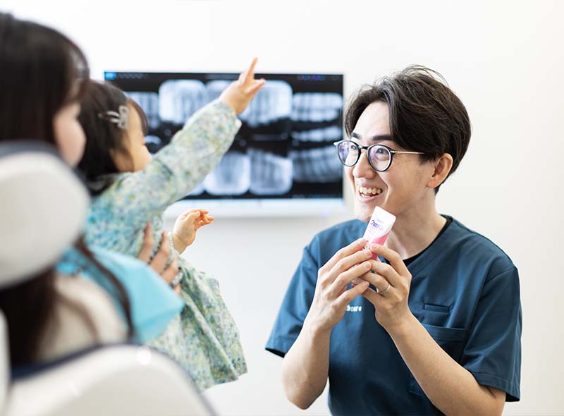 小児歯科の役割は、単にお子さまのむし歯を治療するだけではありません。乳歯には、その下で育つ永久歯が正しい位置に生えるための道しるべという重要な役目があります。乳歯のむし歯を放置すると、永久歯の歯並びや歯質に悪い影響が及ぶ可能性があります。当院では、お子さまが歯科医院を「怖い場所」と思わないよう配慮しながら、健やかな永久歯列の完成をサポートいたします。
