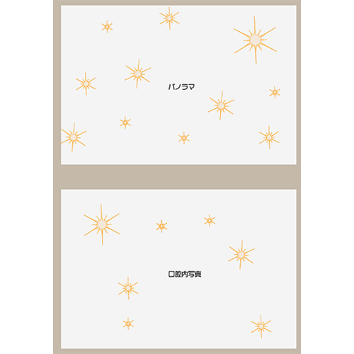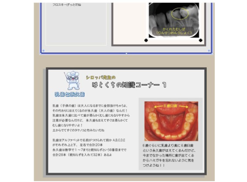 裏面がシールになっている用紙に、口腔内写真やパノラマ写真を貼ってお渡しします。口腔内写真は学年ごとに撮影して貼り付けます。将来、見返して楽しい思い出になればと思っています。