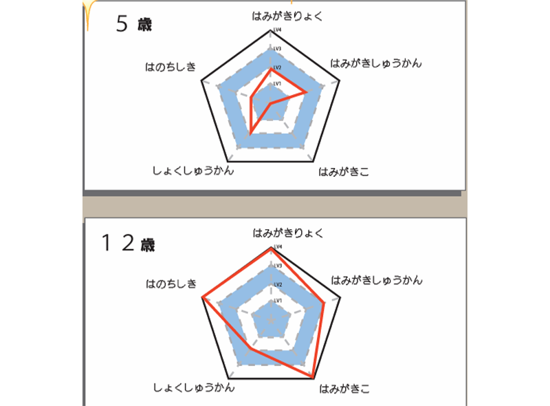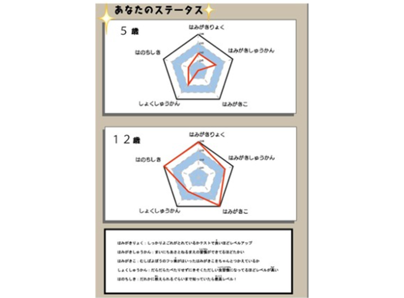 歯の知識や磨き方の上達度をグラフ化したり、メインテナンスの記録をシールで可視化しているため、歯医者に行くのがもっと楽しくなります。